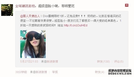 其实只要我们经常关注微博的人就会看到,微博上面的广告还是很多的,特别是服装这一类的。而且这类的微博不仅不会引起关注者的反感,有些带有广告性质的微博还会被大量的转发。因为很多人会对这类的话题感兴趣,她们首先看到的不是广告,而是自己想要的信息,或者是自己感兴趣的话题,所以我们利用微博推广也是一个技术活。不是你单纯的只是在里面发几个广告就可以的。从下面的图片我们可以看出这是一个Dior墨镜的广告,点击链接进入的是一个淘宝店。这是借别人之口来推广的,就是你以一个第三方的角度来看,因为自己觉得这个东西便宜而且很好,才会跟自己的朋友分享。而且还上传了一张真实的图片,增加了信息的可靠度,这样就更容易让别人信服。可以看到下面的转发是一百多,其实一百度在微博的转发量来说的话一点也不多,但是就从一个广告而言他还是不错的。这只是现在微博推广的一种方式而已,我们可以根据自己企业的形式或者商品的具体情况来选择这样的推广方式还适合你自己的企业。