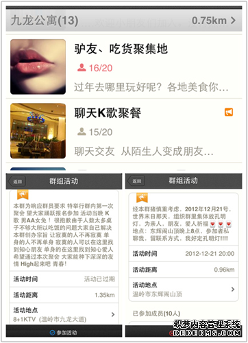 陌陌的初级群人数是20人,LV1是30人。而陌陌群的创建可以选择周围的学校,小区,公司。用户可以搜索附近的群申请加入。群主可以不定期发布活动,而发布的活动系统会提示用户。群的出现,也意味着社区的出现,有社区就有活动,有活动就有消费,有消费就有钱赚。就目前群主所发布的活动而言,以吃饭、唱歌、泡吧等为主。本人也参加过2次群活动。以群为中心,用户根据自己的喜好加入各种群,每个群可以开展不同的活动。通过对活动发起的细分,比如活动的地方、项目等可以推荐想对应的团购项目。