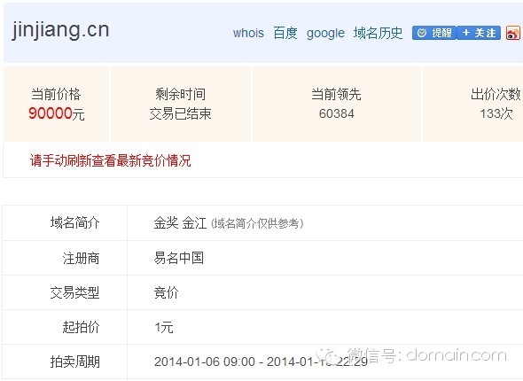 域名投资微信[domaincom]2014年1月20日消息:名网mingwang.com联合创始人之一许建华昨晚向小编透露,他于1月13号以9万元抢下的抢滩域名jinjiang.cn,前天卖给了晋江小鱼网jjj8.cn的站长,售价是15万元整。 jinjiang.cn是1月13号晚上结拍的,经过133次竞价,最终以9万元的价格结拍。地名cn双拼,能竞价到这个价位,说明这个地方的经济相对来说比较发达。 晋江市,雅称刺桐、瑞桐、泉安,为中国福建省下辖县级市,由泉州地级市代管。晋江为福建省综合实力最强的县市,也是中国经济最发达县市之一,其综合竞争力2012 年位居全国百强县(市)第五位。2009年,晋江市GDP总量1095.68亿元,人均GDP为6.6万元。 世界夹克之都、中国品牌之都,海峡西岸经济区经济中心——晋江。自古以来有素有“泉南佛国”、“海滨邹鲁“的美誉。 晋江小鱼网jjj8.cn前身是晋江便民网,后来被厦门小鱼网收购,据许建华介绍,购买jinjiang.cn的是jjj8.cn站长个人行为,与其网站和公司无关。地名双拼一直是地方站长们最喜爱的域名之一,而很巧合的是晋江的两字母缩写域名jj.cn早已是知名的棋牌游戏平台JJ比赛网,不可能再出来流通,所以在cn域名中,jinjiang.cn已经是最好的晋江地方域名了。