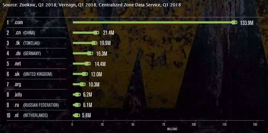 全球通用顶级域名(Top-Level Domain,简称TLD)大约有3.338亿的保有注册量,比2017年第四季度增加了140万个,增长幅度为0.4%。与去年同期相比大约增长了320万个,增长幅度为1.0%。