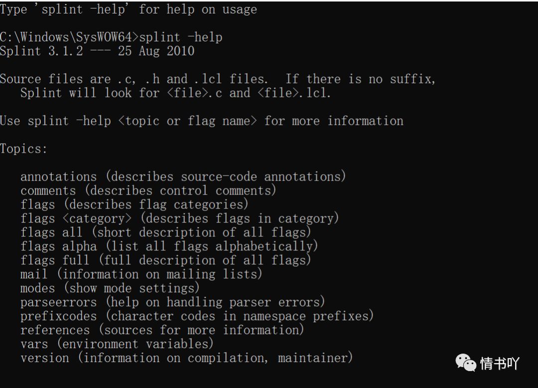 附上成果和-help信息,客户体验说下,该工具更倾向于检验语法错误,其实这个功能编译器也在做,但是角度不同,splint的角度是安全开发角度。