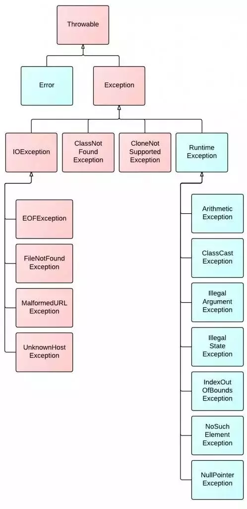 图中红色部分为受检查异常。它们必须被捕获,或者在函数中声明为抛出该异常。
