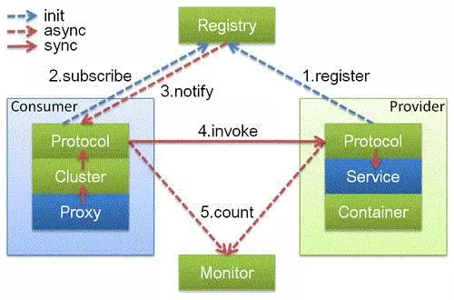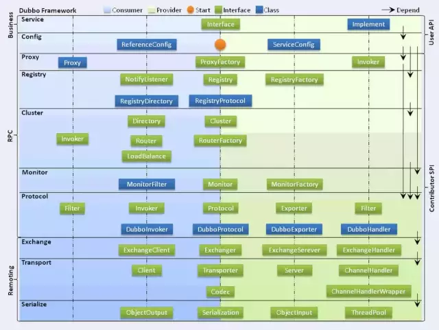 图中的Consumer和Provider是抽象概念,只是想让看图者更直观的了解哪些类分属于客户端与服务器端,不用Client和Server的原因是Dubbo在很多场景下都使用Provider、Consumer、Registry、Monitor划分逻辑拓普节点,保持统一概念。