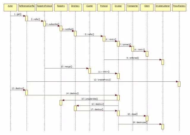 上图中,蓝色的表示与业务有交互,绿色的表示只对Dubbo内部交互。点击这里可以了解更多架构设计图。上述图所描述的调用流程如下: