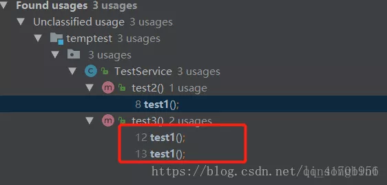 如果我们想知道有哪些地方调用了test1()方法,使用ctrl+alt+h无法正确列出来的。因为ctrl+alt+h只能告诉你调用的层次。