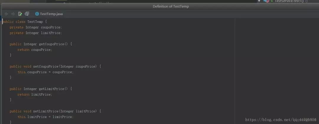 在这个代码块里,你想看看TestTemp类的定义,那么将光标定位在TestTemp上,然后直接使用ctrl+shift+i,就会弹出如下的窗口。