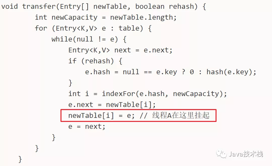 然后在多线程环境下,假设有两个线程A和B都在进行put操作。线程A在执行到transfer函数中第11行代码处挂起,因为该函数在这里分析的地位非常重要,因此再次贴出来。