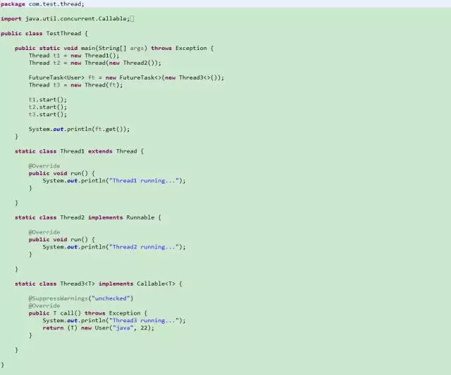 通过实现Callable接口并重写call方法,并把Callable实例传给FutureTask对象,再把FutureTask对象传给Thread对象。它与Thread、Runnable最大的不同是Callable能返回一个异步处理的结果Future对象并能抛出异常,而其他两种不能。