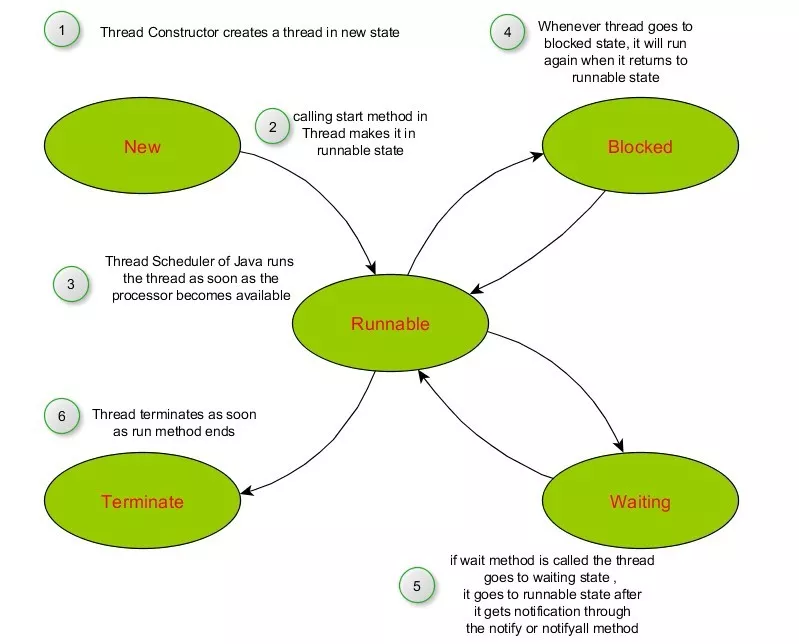 New:创建线程的实例后,它会进入new状态,这是第一个状态,但线程还没有准备好运行。