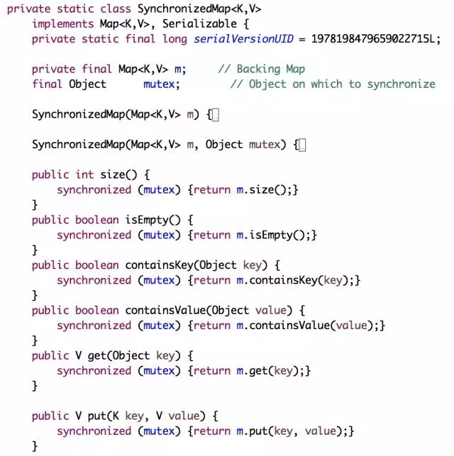 这种是直接使用工具类里面的方法创建SynchronizedMap,把传入进行的HashMap对象进行了包装同步而已,来看看它的源码。