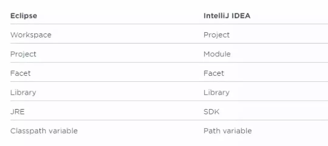 由下图可见:两者最大的转变就在于工作空间概念的转变,并且在IDEA当中,Project和? ?Module是作为两个不同的概念,对项目结构是具有重大意义的,这也恰恰是许多IDEA初学者觉得困扰的地方。