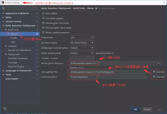 具体步骤:顶部工具栏? File ->Other Settings -> Default Settings -> Build & Tools -> Maven