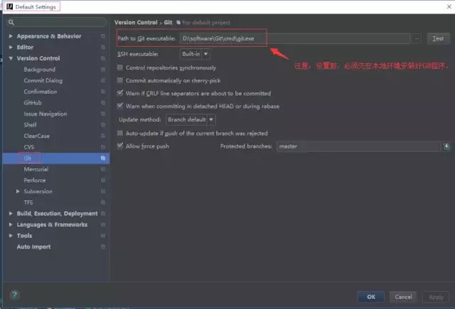 使用说明: IDEA默认集成了对Git/Svn的支持? 直接设置执行程序,右边Test提示成功即可。推荐阅读:超详细的 Git 实战教程,傻瓜一看也会!