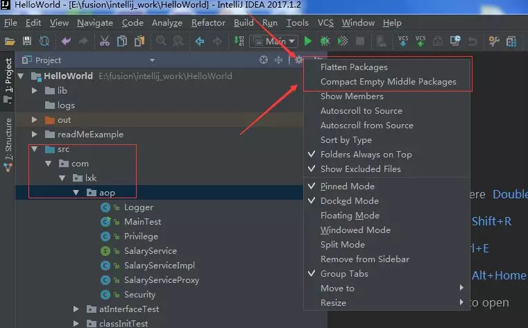 这样子配置,可以很清楚的看到目录的层级结构。但是你要是点了,他就会把空的包直接连在一起,就是com.lxk.aop。。。。等等吧,试一下就知道啦。