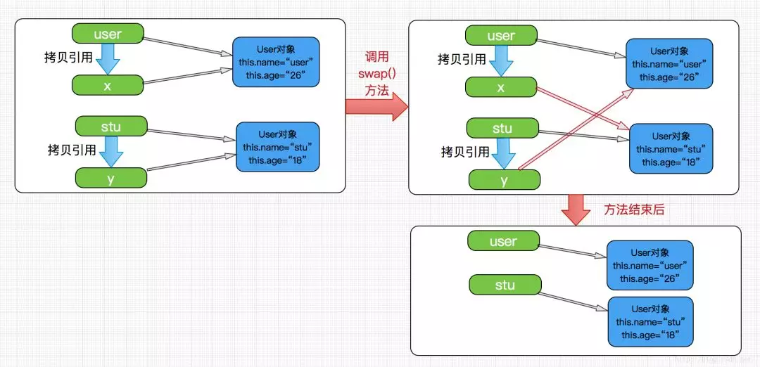 我们发现user和stu的值并没有发生变化,也就是方法并没有改变存储在变量user和stu中的对象引用。swap方法的参数x和y被初始化为两个对象引用的拷贝,这个方法交换的是这两个拷贝的值而已,最终,所做的事都是白费力气罢了。在方法结束后x,y将被丢弃,而原来的变量user和stu仍然引用这个方法调用之前所引用的对象。