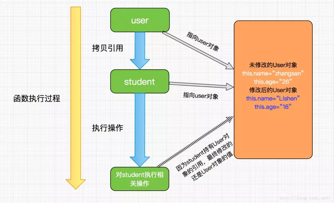 3)方法结束后,student变量不再使用,被释放,而user还是没有变,依然指向User对象。