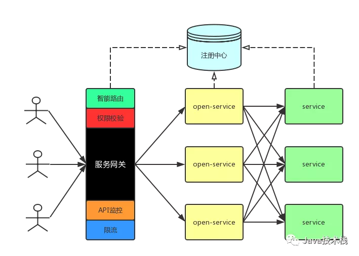 引入服务网关后的微服务架构如上,总体包含三部分:服务网关、open-service和service。关注微信公众号:Java技术栈,在后台回复:架构,可以获取我整理的 N 篇最新架构教程,都是干货。