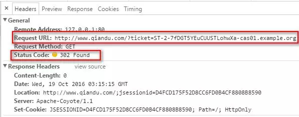 上图就是标号5的请求,以及标号6的响应了。当cas.qiandu.com即csa-server认证通过之后,会返回给浏览器302,重定向的地址就是Referer中的service参数对应的值。后边并通过get的方式挟带了一个ticket令牌,这个ticket就是ST(数字3处)。同时会在Cookie中设置一个CASTGC,该cookie是网站cas.qiandu.com的cookie,只有访问这个网站才会携带这个cookie过去。