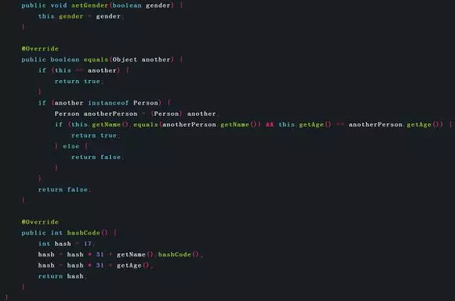下面通过一个例子进行说明。在该例中,Person类重写了equals()方法和hashCode()方法。因为equals()方法中只使用了name域和age域,所以hashCode()方法中,也只计算name域和age域。