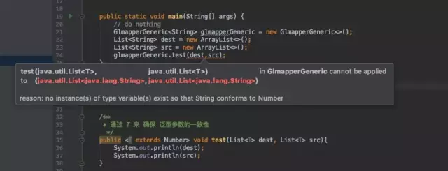 像下面的代码中,约定的 T 是 Number 的子类才可以,但是申明时是用的 String ,所以就会飘红报错。