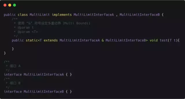 使用 & 符号设定多重边界(Multi Bounds),指定泛型类型 T 必须是 MultiLimitInterfaceA 和 MultiLimitInterfaceB 的共有子类型,此时变量 t 就具有了所有限定的方法和属性。对于通配符来说,因为它不是一个确定的类型,所以不能进行多重限定。