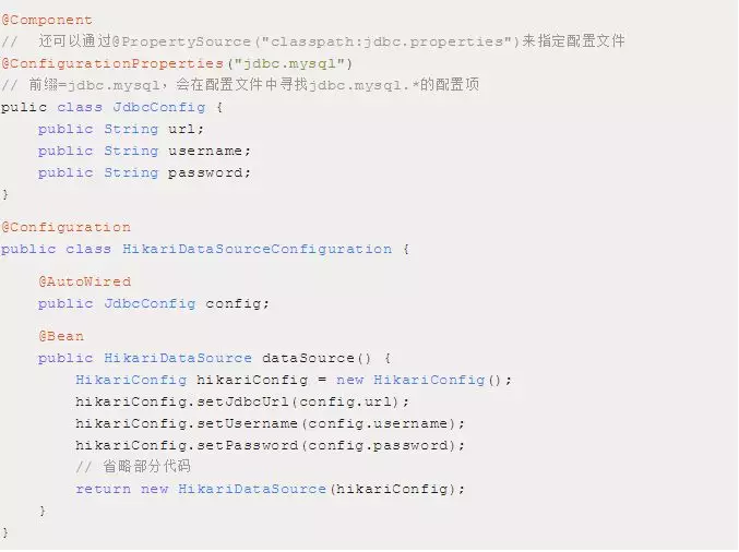 使用 @Value注解注入的属性通常都比较简单,如果同一个配置在多个地方使用,也存在不方便维护的问题(考虑下,如果有几十个地方在使用某个配置,而现在你想改下名字,你改怎么做?)。对于更为复杂的配置,Spring Boot提供了更优雅的实现方式,那就是 @ConfigurationProperties注解。我们可以通过下面的方式来改写上面的代码: