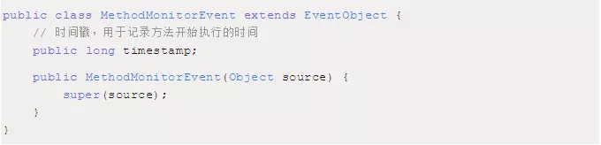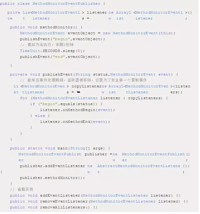 在合适的时机发布事件。此例中的methodMonitor()方法是事件发布的源头,其在方法执行之前和结束之后两个时间点发布MethodMonitorEvent事件,每个时间点发布的事件都会传给相应的监听器进行处理。在具体实现时需要注意的是,事件发布是顺序执行,为了不影响处理性能,事件监听器的处理逻辑应尽量简单。
