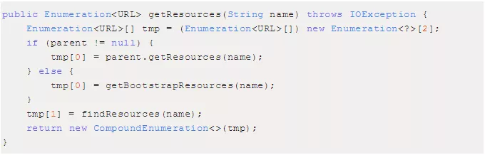 是不是觉得有点眼熟,不错,它的逻辑其实跟类加载的逻辑是一样的,首先判断父类加载器是否为空,不为空则委托父类加载器执行资源查找任务,直到BootstrapClassLoader,最后才轮到自己查找。而不同的类加载器负责扫描不同路径下的jar包,就如同加载class一样,最后会扫描所有的jar包,找到符合条件的资源文件。