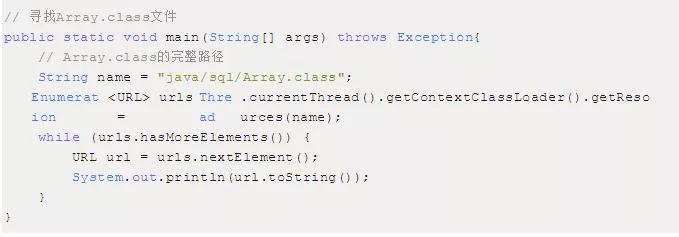类加载器的 findResources(name)方法会遍历其负责加载的所有jar包,找到jar包中名称为name的资源文件,这里的资源可以是任何文件,甚至是.class文件,比如下面的示例,用于查找Array.class文件: