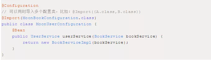 现在有另外一个配置类,比如: MoonUserConfiguration,这个配置类中有一个bean依赖于MoonBookConfiguration中的bookService,如何将这两个bean组合在一起?借助 @Import即可: