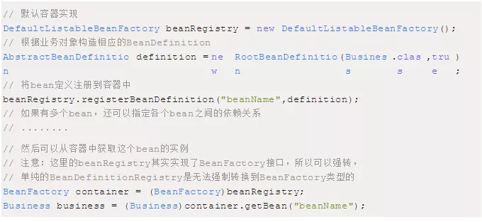 DefaultListableBeanFactory作为一个比较通用的BeanFactory实现,它同时也实现了BeanDefinitionRegistry接口,因此它就承担了Bean的注册管理工作。从图中也可以看出,BeanFactory接口中主要包含getBean、containBean、getType、getAliases等管理bean的方法,而BeanDefinitionRegistry接口则包含registerBeanDefinition、removeBeanDefinition、getBeanDefinition等注册管理BeanDefinition的方法。