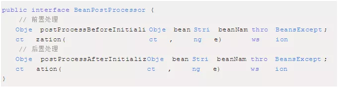 与之相似的,还有 BeanPostProcessor,其存在于对象实例化阶段。跟BeanFactoryPostProcessor类似,它会处理容器内所有符合条件并且已经实例化后的对象。简单的对比,BeanFactoryPostProcessor处理bean的定义,而BeanPostProcessor则处理bean完成实例化后的对象。BeanPostProcessor定义了两个接口:
