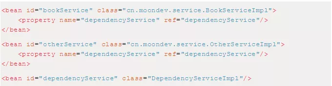 你可能注意到这个示例中,有两个bean都依赖于dependencyService,也就是说当初始化bookService时会调用 dependencyService(),在初始化otherService时也会调用 dependencyService(),那么问题来了?这时候IOC容器中是有一个dependencyService实例还是两个?这个问题留着大家思考吧,这里不再赘述。