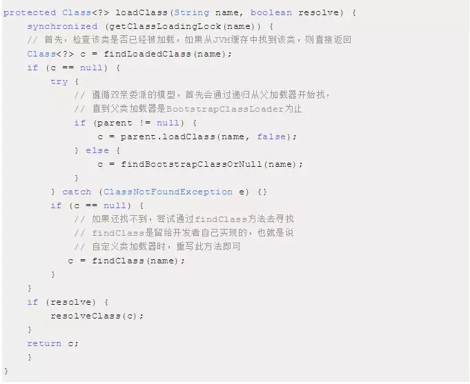 采用双亲委派模型的一个好处是保证使用不同类加载器最终得到的都是同一个对象,这样就可以保证Java 核心库的类型安全,比如,加载位于rt.jar包中的 java.lang.Object类,不管是哪个加载器加载这个类,最终都是委托给顶层的BootstrapClassLoader来加载的,这样就可以保证任何的类加载器最终得到的都是同样一个Object对象。查看ClassLoader的源码,对双亲委派模型会有更直观的认识: