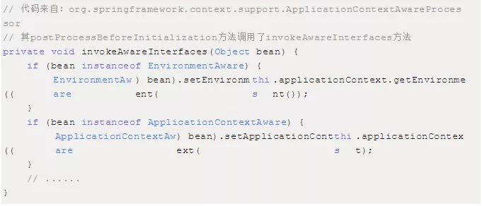 再来看一个更常见的例子,在Spring中经常能够看到各种各样的Aware接口,其作用就是在对象实例化完成以后将Aware接口定义中规定的依赖注入到当前实例中。比如最常见的 ApplicationContextAware接口,实现了这个接口的类都可以获取到一个ApplicationContext对象。当容器中每个对象的实例化过程走到BeanPostProcessor前置处理这一步时,容器会检测到之前注册到容器的ApplicationContextAwareProcessor,然后就会调用其postProcessBeforeInitialization()方法,检查并设置Aware相关依赖。看看代码吧,是不是很简单: