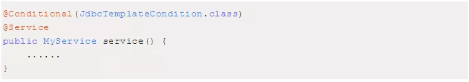 这个例子中只有当 JdbcTemplateCondition类的条件成立时才会创建MyService这个bean。也就是说MyService这bean的创建条件是 classpath里面包含 JdbcTemplate,否则这个bean的声明就会被忽略掉。