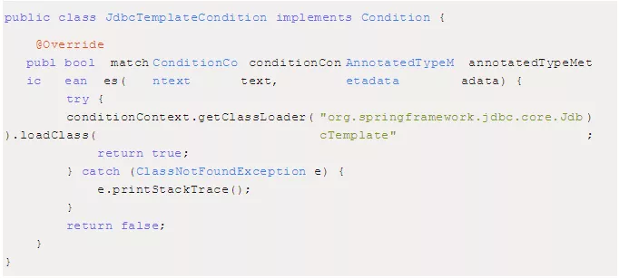 在Spring里可以很方便的编写你自己的条件类,所要做的就是实现 Condition接口,并覆盖它的 matches()方法。举个例子,下面的简单条件类表示只有在 Classpath里存在 JdbcTemplate类时才生效: