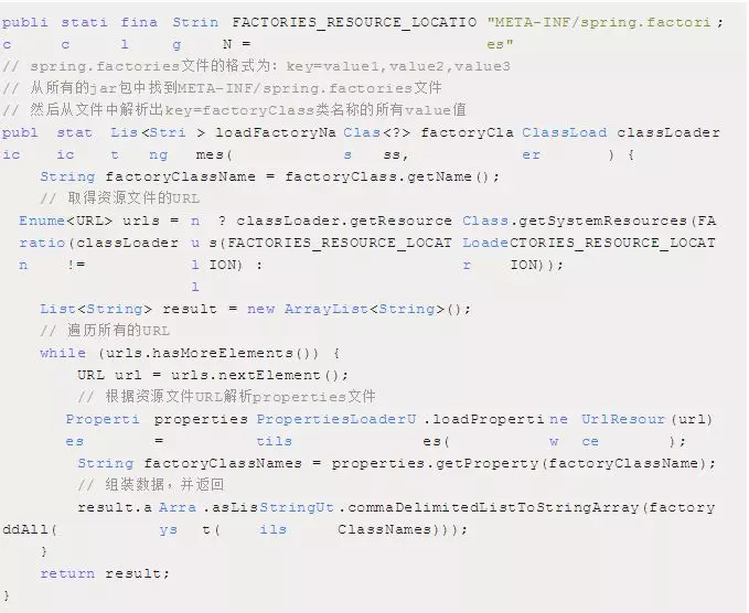 这就是 SpringFactoriesLoader,它本质上属于Spring框架私有的一种扩展方案,类似于SPI,Spring Boot在Spring基础上的很多核心功能都是基于此,希望大家可以理解。