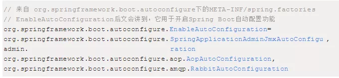 这个类会扫描所有的jar包,将所有符合条件的@Configuration配置类注入的容器中,何为符合条件,看看 META-INF/spring.factories的文件内容: