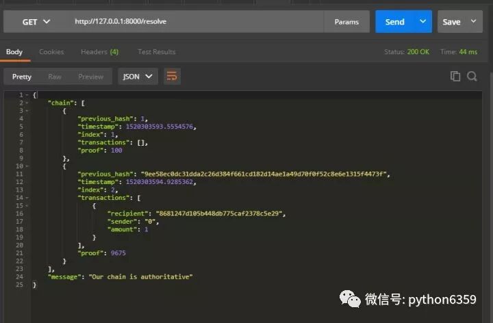 第2个方法 resolve_conflicts() 用来解决冲突,遍历所有的邻居节点,并用上一个方法检查链的有效性, 如果发现有效更长链,就替换掉自己的链
