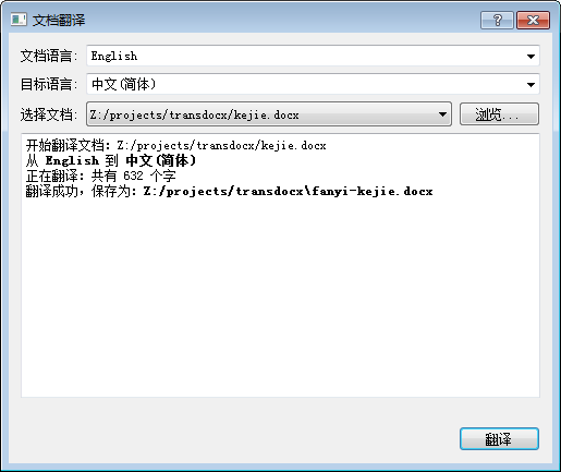 边学边写界面耗时很长,剩下的就简单多了。读取 docx 用 python-docx 库,翻译用前面说的 googletrans,一气呵成。最后,把提示语言写到界面的文本区域时遇到点问题,还是 Qt 不熟悉造成的,继续学习,其实就是 Qt 的信号传递。大功告成,测试一下: