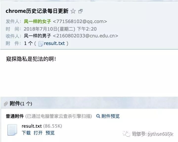 msg.attach(MIMEText('窥探隐私是犯法的啊!', 'plain', 'utf-8'))