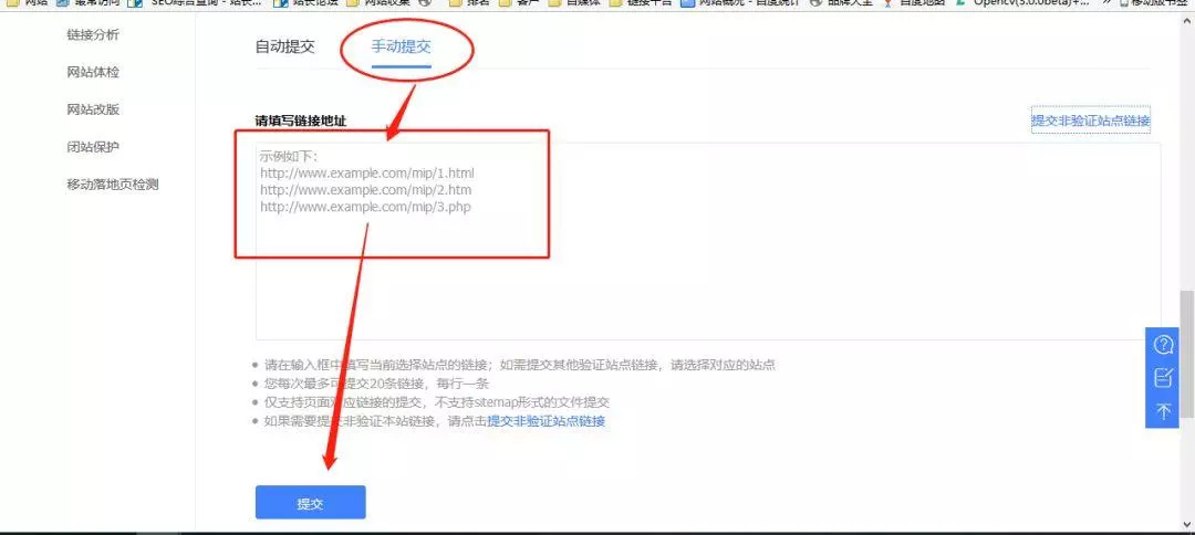 当然如果你是想提交其他网站文章收录,可以点击上面截图右侧的提交非验证站点链接,直接提交就可以了,效果是一样的。