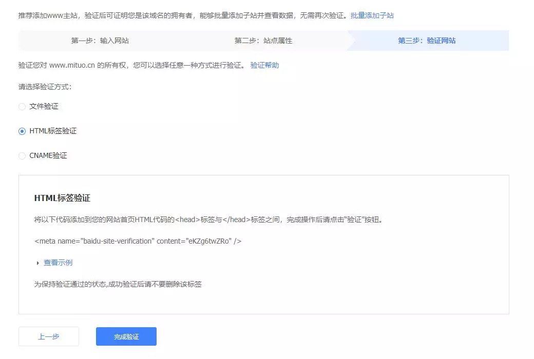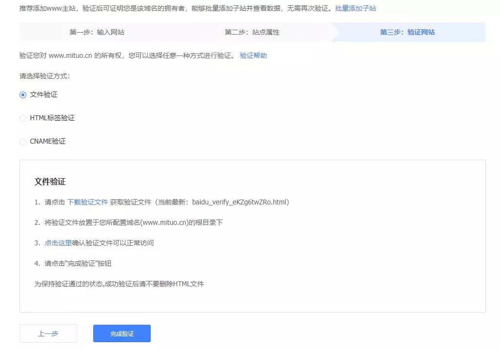 如果之前没有绑定过,会提示你绑定网站,大家直接按提示操作就可以,常用的是文件验证和HTML验证。文件验证是下载验证文件,将其上传到网站根目录,然后点击完成验证就成功了。